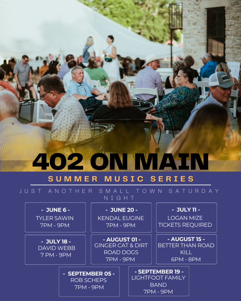 Known for his authentic Midwest roots and chart-climbing country hits, Logan Mize delivers the kind of high-energy, feel good show that brings a crowd together. This is a summer memory in the making. We’re transforming 402 on Main into the ultimate live music experience right here in the Flint Hills. Expect great sound, cold drinks, and electric atmosphere you won’t find anywhere else in Alms.